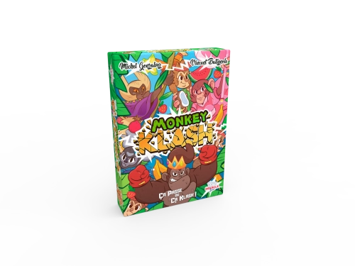 Monkey Klash : ça passe ou ça Klash ! Malice / Rapidité / Observation / Collection âge : 7+ / Nombre de joueurs : 2 à 5 / Durée d’une partie : 10 – 20 min Auteur : Michel Gonzalvez / Illustrateur : Vincent Batignole / éditeur : Débâcle Jeux A propos : De splendides fruits tombent des arbres et s’entassent dans la clairière. Chaque tribu de singes envoie ses membres tenter de faire la meilleure récolte. Perchés dans les arbres, ils guettent le signal qui les autorisera à se jeter dans la mélée pour chiper le fruit de leur convoitise. Parfois, ils s’en tirent sans encombre, mais plus souvent, il leur faudra accepter de partager selon la bonne vieille loi du plus fort… Description : Des cartes jungle avec des fruits ou des abeilles sont disposées sur la table. A chaque tour, vous allez envoyer l’un des singes de votre main tenter de récupérer la carte qui vous intéresse ! Si deux singes identiques sont joués, soyez le plus rapide à taper sur la pile de fruits mystère pour avoir vos chances de vous servir en premier ! Certains singes ont des pouvoirs, utilisez-les avec malice et ruse pour terminer avec le panier le plus rempli !Consultez les règles en suivant ce lien. Contenu : -50 cartes Singe : 5 tribus de 10 cartes-54 cartes Jungle